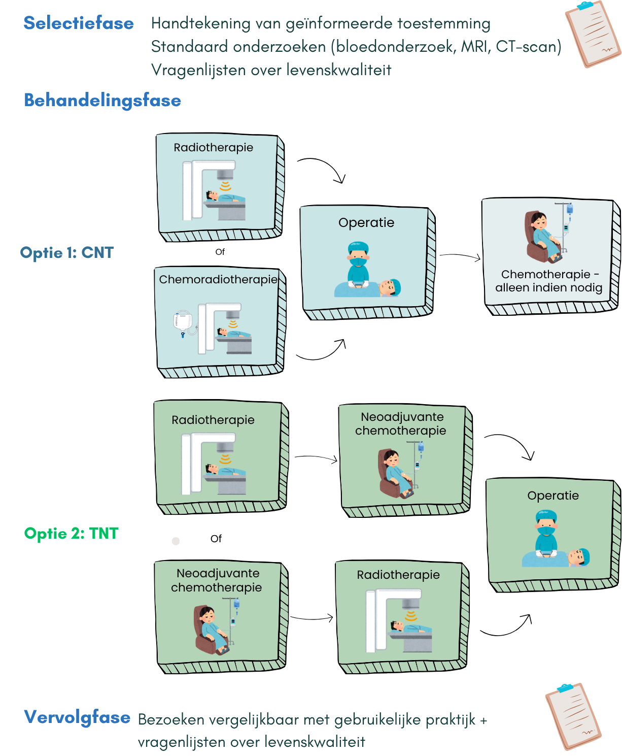 - Conventionele neoadjuvante therapie (CNT): dit omvat radiotherapie of radio(chemo)therapie gevolgd door de operatie. Alleen indien nodig krijgt de patiënt na de operatie chemotherapie.